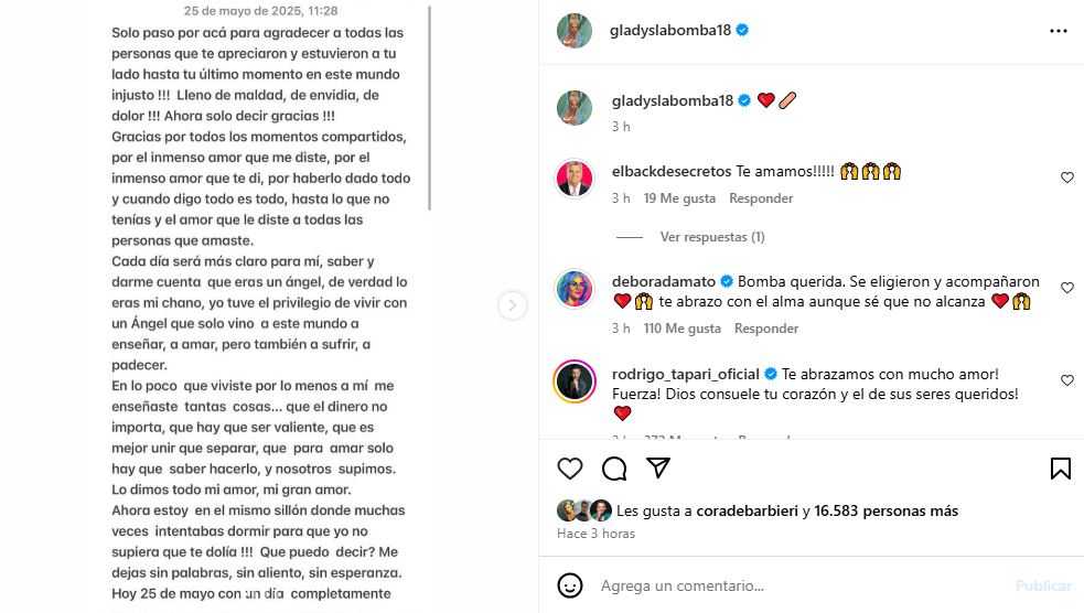 En sus redes sociales, Gladys decidió compartir su agradecimiento a la gente y despedir a su gran amor: "Solo paso por acá para agradecer a todas las personas que te apreciaron y estuvieron a tu lado hasta tu último momento en este mundo injusto, lleno de maldad, de envidia y de dolor. Solo resta decir gracias!!! Gracias por todos los momentos compartidos, por el inmenso amor que me diste, por el inmenso amor que te di, por haberlo dado todo. Y cuando digo todo es todo, hasta lo que no tenías y el amor que le diste a todas las personas que amaste".