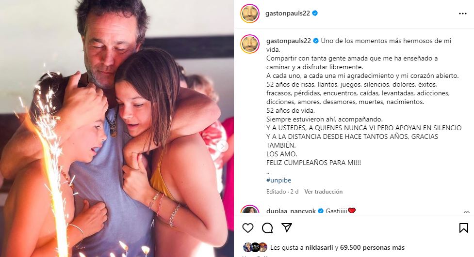 En el mismo tono y quizá, haciendo un repaso silencioso por cada uno de los años que lo acercó a este presente, Gastón agregó: “52 años de risas, llantos, juegos, silencios, dolores, éxitos, fracasos, pérdidas, encuentros, caídas, levantadas, adicciones, dicciones, amores, desamores, muertes, nacimientos. 52 años de vida. Siempre estuvieron ahí, acompañando”.