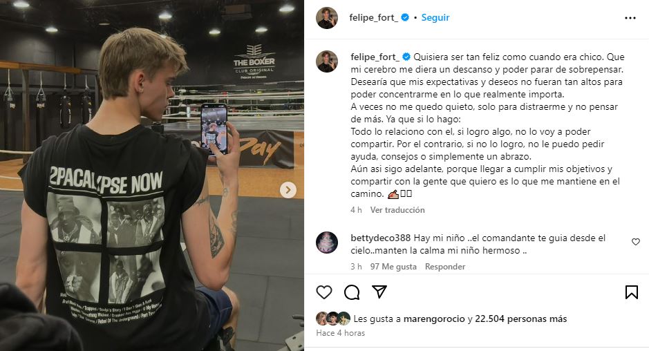 Felipe, uno de los hijos de Ricardo Fort, es de pocas palabras. Cada tanto realiza un posteo en el que muestra parte de cómo va transitando su vida, pero en líneas generales, ha optado por un bajo perfil. Hace algunas horas, decidió compartir parte de lo que le pasa y siente, y sin lugar a dudas, habló desde el corazón con desgarradoras palabras.
