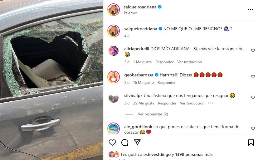 “NO ME QUEJO, ME RESIGNO? 🤦🏻♀️” De esta manera, Adriana Salgueiro compartía en sus redes la imagen del vidrio roto de su auto, anunciando que, como a muchos, alguien había vandalizado su vehículo y robado parte de las pertenencias que tenía en el interior.