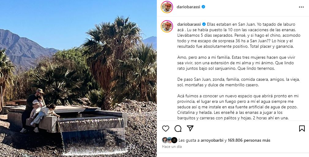 En un arrebato de extrañarlas y necesitarlas cerca, Darío Barassi pensó una estrategia para acortar la distancia y la llevó a cabo: "Ellas estaban en San Juan. Yo tapado de laburo acá. Lu se había puesto la 10 con las vacaciones de las enanas. Llevábamos 5 días separados. Pensé, y si hago el chino, acomodo todo y me escapo de sorpresa 36 hs a San Juan?? Lo hice y el resultado fue absolutamente positivo. Total placer y ganancia".