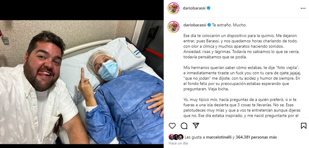 "Te extraño. Mucho". Con estas tres palabras, Darío Barassi compartía un nuevo y sentido posteo dedicado a su mamá. Una nueva demostración de lo que duele su pérdida y de lo que va siendo la vida sin ella, sin Laura, quien falleciera en noviembre de 2023 tras una dura batalla contra un cáncer de páncreas.