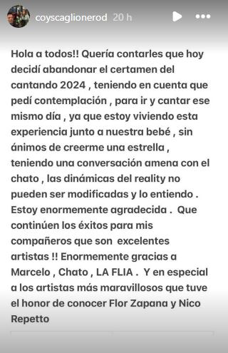 Sus redes fueron el camino a la aclaración para sus más de 89 seguidores, que obviamente querían saber qué había pasado con Coy: "¡Hola a todos! Quería contarles que hoy decidí abandonar el certamen de Cantando 2024, teniendo en cuenta que pedí contemplación para poder ir y cantar ese mismo día ya que estoy viviendo esta experiencia junto a nuestra bebé, sin ánimos de creerme una estrella".