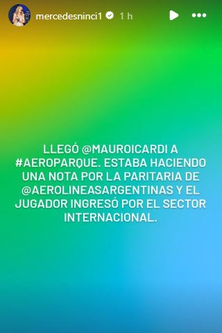 Pero quien también dio señales de esta situación fue Mercedes Ninci desde sus redes sociales. Porque mientras cubría un tema de actualidad, se encontró con la información exclusiva de uno de los temas mediáticos del momento: "Llegó @mauroicardi a #aeroparque. Estaba haciendo una nota por la paritaria de @aerolineasargentinas y el jugador ingresó por el sector internacional".