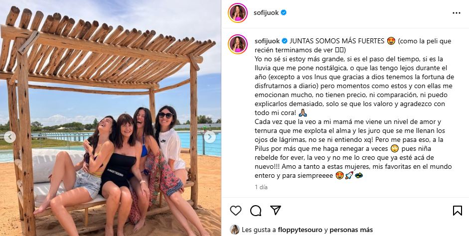 Junto a una foto en la que muestra complicidad y mucho amor, la modelo escribió: "JUNTAS SOMOS MÁS FUERTES 😍 (como la peli que recién terminamos de ver). Yo no sé si estoy más grande, si es el paso del tiempo, si es la lluvia que me pone nostálgica, o que las tengo lejos durante el año (excepto a vos Inus que gracias a dios tenemos la fortuna de disfrutarnos a diario) pero momentos como estos y con ellas me emocionan mucho, no tienen precio, ni comparación, ni puedo explicarlos demasiado, solo se que los valoro y agradezco con todo mi cora! 🙏🏼".