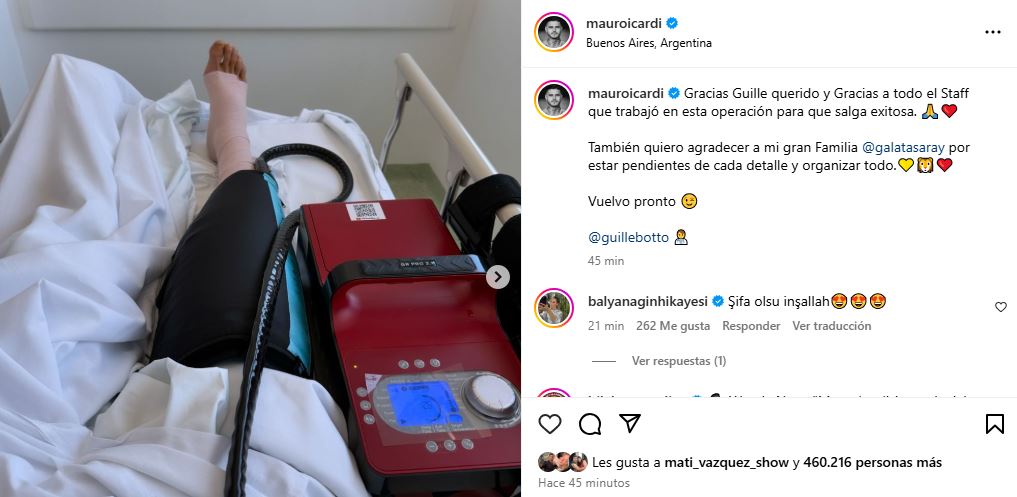 Mauro compartió una foto en la que se lo ve junto a su cirujano y otras en las que muestra el presente de su pierna derecha a minutos de haber abandonado el quirófano. Junto a ellas escribió: "Gracias Guille querido y Gracias a todo el Staff que trabajó en esta operación para que salga exitosa. 🙏❤️ También quiero agradecer a mi gran Familia @galatasaray por estar pendientes de cada detalle y organizar todo.💛🦁❤️".
