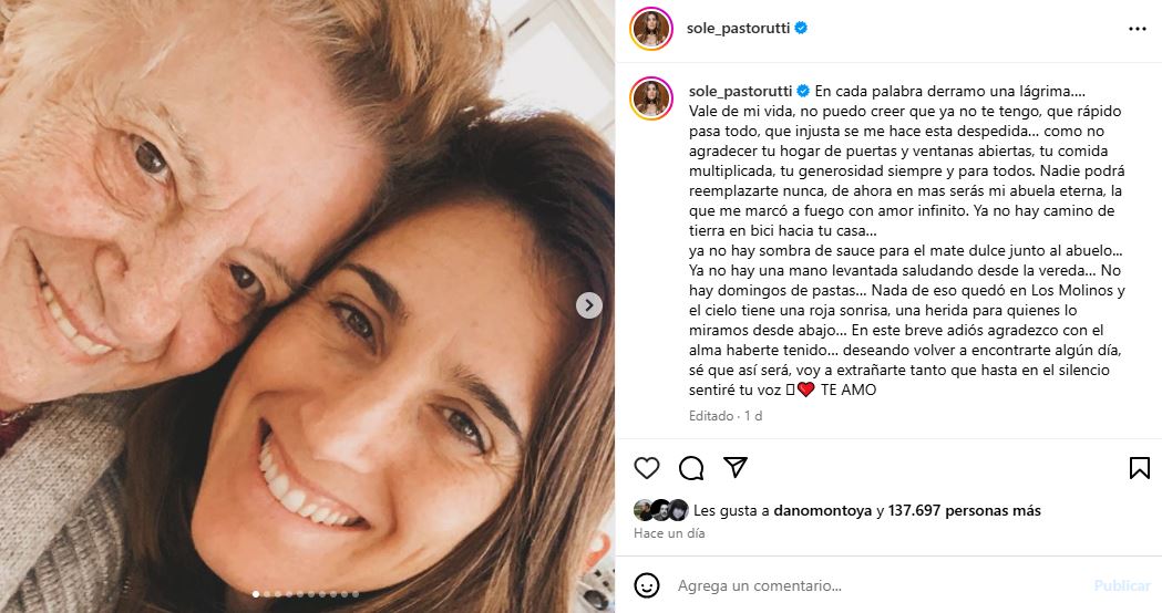 Soledad la recordó igual que la llevará por siempre dentro suyo, en las cosas que se hacen con las personas que amamos en vida... El abrazo, la mirada, el gesto y los sentimientos sinceros:"Ya no hay sombra de sauce para el mate dulce junto al abuelo... Ya no hay una mano levantada saludando desde la vereda… No hay domingos de pastas… Nada de eso quedó en Los Molinos y el cielo tiene una roja sonrisa, una herida para quienes lo miramos desde abajo… En este breve adiós agradezco con el alma haberte tenido… deseando volver a encontrarte algún día, sé que así será, voy a extrañarte tanto que hasta en el silencio sentiré tu voz. ❤️ TE AMO".