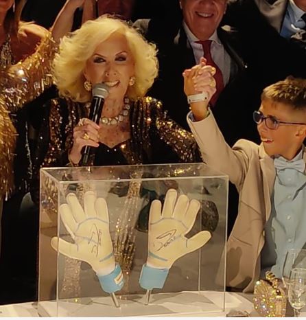 Uno de los momentos más sobresalientes y emotivos de la noche se dio cuando se anunció la subasta de los guantes que el "Dibu" Martínez utilizó en la final de la Copa América 2024 ante Colombia. Una vez más, fueron varios los asistentes a esta gala que se disputaban este objeto tan preciado. Obviamente, el objetivo es recaudar fondos para el Hospital Materno Infantil. Ya en 2023, Mirtha había acercsado para la subasta, la camiseta de Lio Messi, hoy, quien acercó los guantes para la subasta fue el papá del arquero de la Selección Nacional.