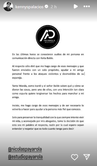 Al salir a la luz estos audios, Kennys Palacios decidió hacer su descargo en redes, asesorado por sus abogados: "En las últimas horas se conocieron audios de mi persona en comunicación directa con Keita Baldé. Al respecto solo diré que me hago cargo de esos mensajes y que fueron enviados con un solo propósito, ayudar a mi amiga personal frente a los ataques violentos y desmedidos de su expareja".