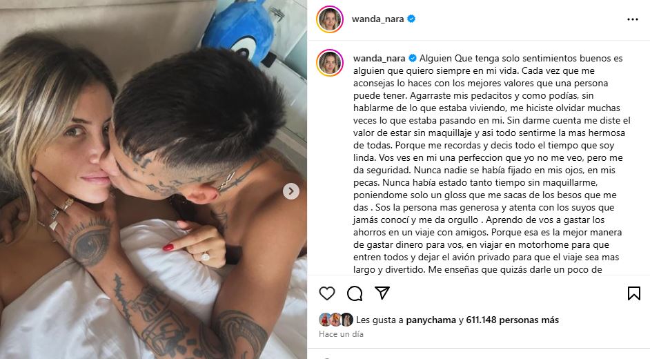 De esta manera, Wanda comenzaba su carta de amor y compartía en sus redes emociones profundas y aprendizajes que le regala el hombre que hoy ocupa su corazón: "Sin darme cuenta me diste el valor de estar sin maquillaje y así y todo, sentirme la mas hermosa de todas. Porque me recordás y decís todo el tiempo que soy linda. Vos ves en mi una perfección que yo no me veo, pero me da seguridad. Nunca nadie se había fijado en mis ojos, en mis pecas. Nunca había estado tanto tiempo sin maquillarme, poniéndome solo un gloss que me sacas de los besos que me das".