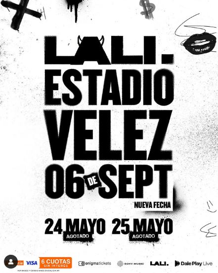 Lali, sorprendió y enloqueció a sus fans con el anuncio de una nueva y tercera fecha en el Estadio Vélez el día 6 de septiembre. La reina del pop argentino, a través de un video con su humor característico, comentó que a raíz de un ajuste sujeto al agregado de nuevas fechas en la agenda deportiva, se sumaba la necesidad de modificar las fechas de las primeras funciones y la producción de la artista se vió obligada a reprogramar las fechas de los shows en el estadio Vélez Sarsfield de los días 30 de abril y 1 de mayo al 24 y 25 de mayo respectivamente. Las mismas localidades, se encuentran totalmente agotadas.