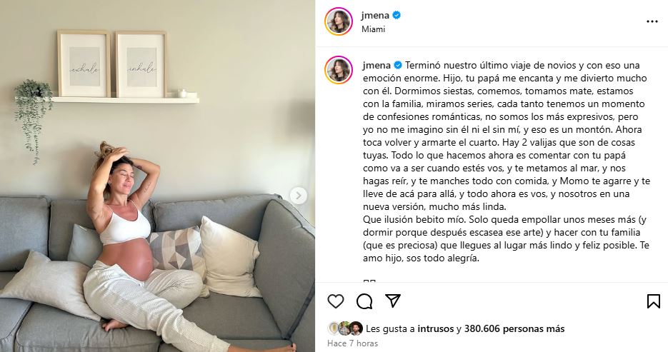Se termina el descanso y los paisajes, pero para Jimena, Matías y Momo, comienza una etapa con un montón de sorpresas y nuevas emociones: "Que ilusión bebito mío. Solo queda empollar unos meses más (y dormir porque después escasea ese arte) y hacer con tu familia (que es preciosa) que llegues al lugar más lindo y feliz posible. Te amo hijo, sos todo alegría".