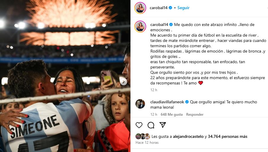 Carolina expresaba lo que esa corrida y ese gol y ese momento le habían significado a lo largo de sus jóvenes 22 años a su hijo... Ese instante por el que se trabaja tanto y un día, sucede: "Que orgullo siento por vos, y por mis tres hijos. 22 años preparándote para este momento, el esfuerzo siempre da recompensas! Te amo ❤️".