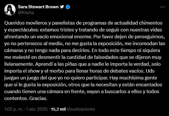 Obviamente, la interna familiar ha levantado un montón de polvareda, que traspasó los límites de la intimidad. La búsqueda constante de la prensa por su testimonio la llevó a realizar un contundente posteo en sus redes: “Queridos movileros y panelistas de programas de actualidad, chimentos y espectáculos: Estamos tristes y tratando de salir con nuestras vidas, afrontando un vacío emocional enorme. Por favor, dejen de perseguirnos, yo no pertenezco al medio, no me gusta la exposición, me incomodan las cámaras y no tengo nada para decirles.