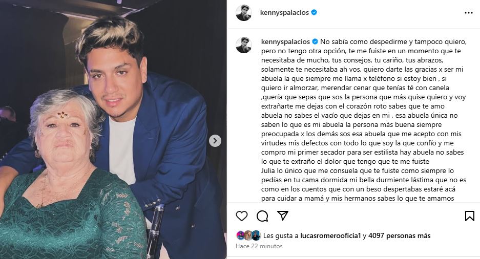 Sin lugar a dudas, el dolor que provoca la partida de un ser querido es desgarrador y así lo siente Kennys: "Julia, lo único que me consuela es que te fuiste como siempre lo pedías, en tu cama, dormida... Mi bella durmiente, lástima que no es como en los cuentos que con un beso despertabas. Estaré acá para cuidar a mamá y mis hermanos, sabes lo que te amamos abuela... abuela... te fuiste. Te juro y prometo que mamá estará bien, espero que te encuentres con el abuelo y papá y sé que nos estarán cuidando desde el cielo, te voy a querer por siempre, sos la persona que me sacaba una sonrisa, que me sacaba una risa, muchos me dicen que estas en un lugar mejor y eso lo sé, pero yo te quiero conmigo, te quiero acá, dándome esos abrazos que me animaba el día que me daban ganas de vivir, extraño tus abrazos, tus besos, tu cariño extraño pasar momentos con vos, por más viajes..."