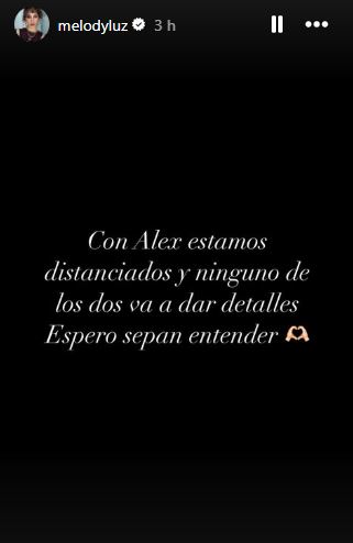 Apenas unos minutos después, quien decidió hablar fue Melody Luz, la otra protagonista de la historia de amor, la que va a dar el sonido de la otra campana. En sus redes, Melody confirmó el final y dio detalles de cómo piensan afrontar este momento: "Con Alex estamos distanciados y ninguno de los dos va a dar detalles. Espero sepan entender".