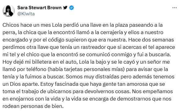Ese Dios aparte la hizo llegar a una reflexión quwe todos conocemos, pero a veces caemos en la facilidad de enojarnos con la vida y el mundo: "Estoy fascinada que haya gente tan amorosa que se toma el trabajo de ubicarnos para devolvernos cosas. Nos empeñamos en enojarnos con la vida y la vida se encarga de demostrarnos que nos rodean personas de bien".