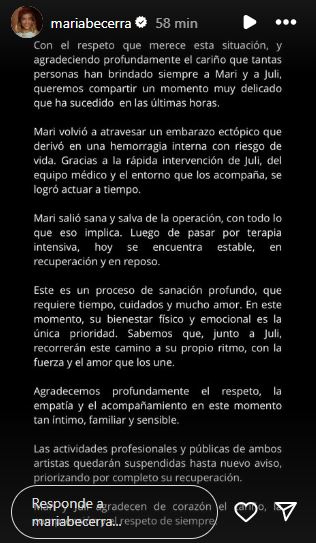 De todas maneras, la incertidumbre sobre los motivos que llevaron a María Becerra a una internación, sobre todo cuando se hablaba de hemorragia interna, obligó a que se diera a conocer un comunicado oficial: "Con el respeto que merece esta situación, y agradeciendo profundamente el cariño que tantas personas han brindado siempre a Mari y a Juli, queremos compartir un momento muy delicado que ha sucedido en las últimas horas. Mari volvió a atravesar un embarazo ectópico que derivó en una hemorragia interna con riesgo de vida. Gracias a la rápida intervención de Juli, del equipo médico y el entorno que los acompaña, se logró actuar a tiempo".