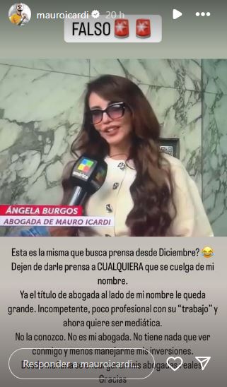 Tras ver a la Dra. Burgos en "A la Tarde", Mauro subió una captura de pantalla con su imagen en sus historias de IG e inició su descargo: "Dejen de darle prensa a cualquiera que se cuelga de mi nombre. Ya el título de abogada al lado de mi nombre le queda grande. Incompetente, poco profesional con su ‘trabajo’ y ahora quiere ser mediática".