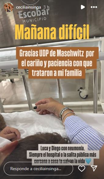 En el mismo posteo, Cecilia compartió una foto de esta mañana de internación y agregó: “Luca y Diego con Neumonía. Siempre el hospital o la salita pública más cercana a casa te salvan la vida”.