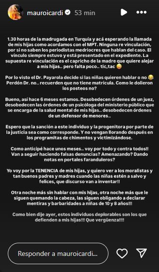 "1.30 horas de la madrugada en Turquía y acá esperando la llamada de mis hijas como acordamos con el MPT. Ninguna revinculación, por si no saben los periodistas mediocres que hablan del caso". De esta manera, Mauro Icardi comenzaba a expresar su bronca, en la que no faltó sus fuertes palabras contra los medios. "El vínculo siempre estuvo y está presentado en el expediente. La supuesta revinculación es el capricho de la madre que quiere alejar a mis hijas... Pero falta poco... Tic Tac".