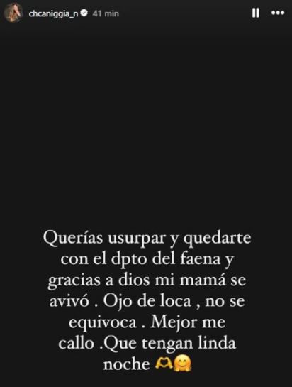 En defensa de su madre, la familia y de sus propias convicciones, Charlotte cerró filosa y contundente: "Quería usurpar y quedarte con el departamento del Faena y, gracias a Dios, mi mamá me avivó. Ojo de loca, no se equivoca. Mejor me callo. Que tengan linda noche".