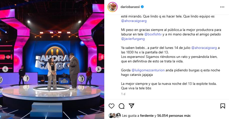 Disfrutar de la tele es una sensación casi natural para Darío Barassi. La ama y la disfruta en la misma intensidad y para sostener sus emociones siempre está la familia para contenerlo. Agradecido, pero con ganas de hacer catarsis, así cerraba su descargo el actor y conductor: "Mi peso en gracias siempre al público,a la mejor productora para laburar en tele @boxfishtv y a mi mano derecha el amigo pelado @javierfurgang. Ya saben bebés, a partir del lunes 14 de julio @ahoracaigoarg a las 18.30 por la pantalla del 13. Los esperamos! Sigamos riéndonos un rato y pensándola bien, que en definitiva de esto se trata la vida. Gorda @luligomezcenturion anda pidiendo burgas que esta noche hago catarsis jajajaja. La mejor siempre y que la nueva noche del 13 la explote toda. Que viva la tele bbs".