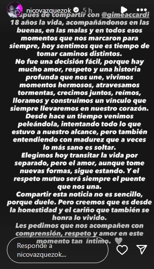 Las redes sociales fueron el camino para hacer conocer la noticia y así lo comunicaba en sus historias de instagram: "Después de compartir con @gimeaccardi 18 años de vida, acompañándonos en las buenas, en las malas y en todos esos momentos que nos marcaron para siempre, hoy sentimos que es tiempo de tomar caminos distintos. No fue una decisión fácil porque hay mucho amor, respeto y una historia profunda que nos une. Vivimos momentos hermosos, atravesamos tormentas, crecimos juntos, reímos, lloramos, construimos un vínculo que siempre llevaremos en nuestro corazón".
