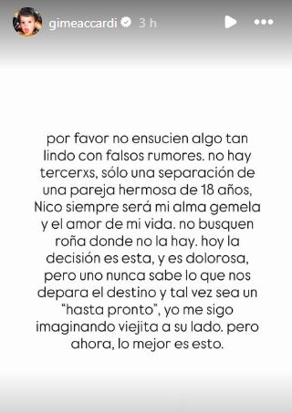 En medio de los rumores y apenas unos minutos después de la publicación en la que hablaba de su separación del actor, Gimena se volvió a trepar a sus redes para desmentir cualquier comentario que hable de alguien interpuesto en su historia de amor: "Por favor no ensucien algo tan lindo con falsos rumores. No hay tercerxs, solo la separación de una pareja hermosa de 18 años".