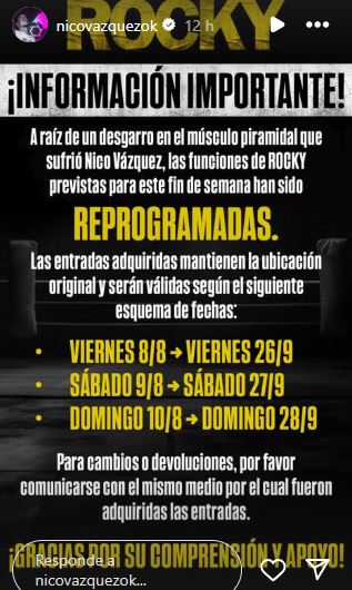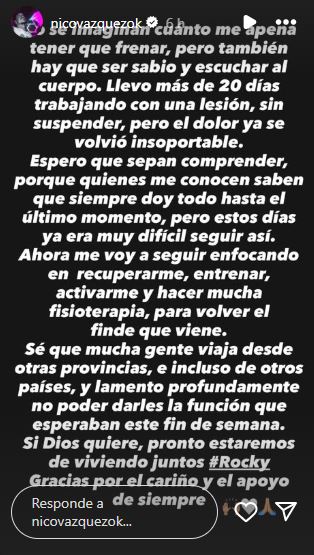 Nico lo intento, pero como él mismo lo aseguró, debía parar y no exigir más de lo necesario a su cuerpo: "Ahora me voy a seguir enfocando en recuperarme, entrenar, activarme y hacer mucha fisioterapia para volver el finde que viene. Se que mucha gente viaja desde otras provincias, e incluso de otros países y lamento profundamente no poder darles la función que esperaban este fin de semana. Si Dios qjuiere, pronto estaremos viviendo juntos #Rocky. Gracias por el cariño y el apoyo de siempre".