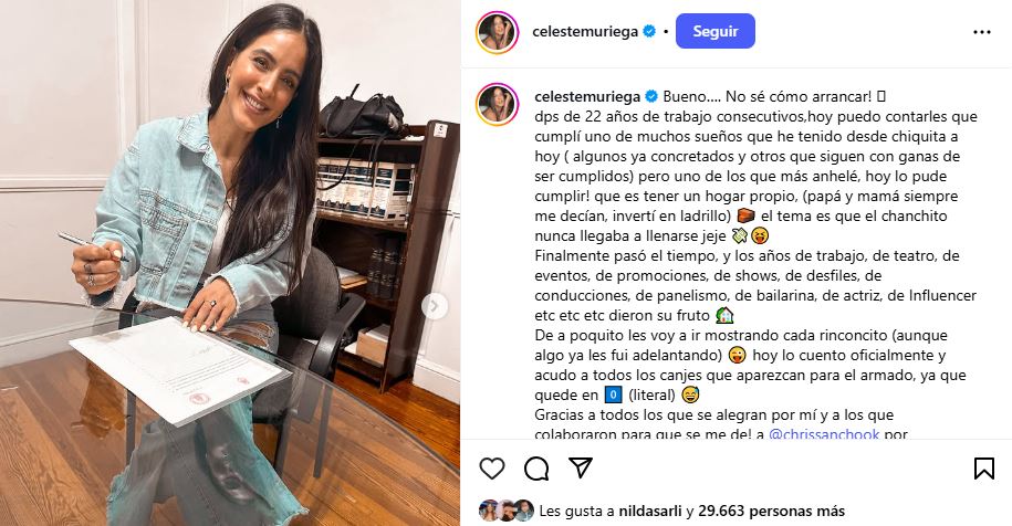 Poniéndole un poco de suspenso a la noticia, Celeste Muriega contó de qué se trataba su alegría: "Pude cumplir el sueño de tener un hogar propio, (papá y mamá siempre me decían, invertí en ladrillo) 🧱. El tema es que el chanchito nunca llegaba a llenarse jeje 💸😝. Finalmente pasó el tiempo, y los años de trabajo, de teatro, de eventos, de promociones, de shows, de desfiles, de conducciones, de panelismo, de bailarina, de actriz, de Influencer etc etc etc dieron su fruto 🏡".
