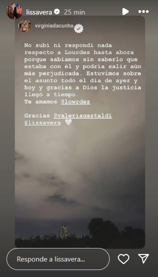 Hace minutos, quien habló de Lowrdez y rompió el silencio fue su también compañera en "Bandana", Virginia Da Cunha, que utilizó sus redes para expresarse: "No subí ni respondí nada respecto a Lourdes hasta ahora porque sabíamos sin saberlo que estaba con él y podía salir aún más perjudicada. Estuvimos sobre el asunto todo el día de ayer y hoy y gracias a Dios la justicia llegó a tiempo. Te amamos @lowrdez. Gracias @valeriagastaldi @lissavera".