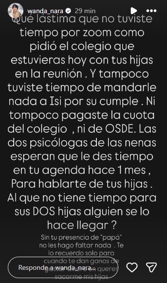 En medio de todo este caos que no parece terminar nunca, Wanda se lanzó a sus redes y le dedicó párrafos bastante fuertes a su ex, por no estar presente en una reunión virtual por el colegio de sus pequeñas: “Qué lástima que no tuviste tiempo por zoom como pidió el colegio que estuvieras hoy con tus hijas en la reunión. Y tampoco tuviste tiempo de mandarle nada a (tu hija) por su cumple. Ni tampoco pagaste la cuota del colegio, ni de OSDE”.