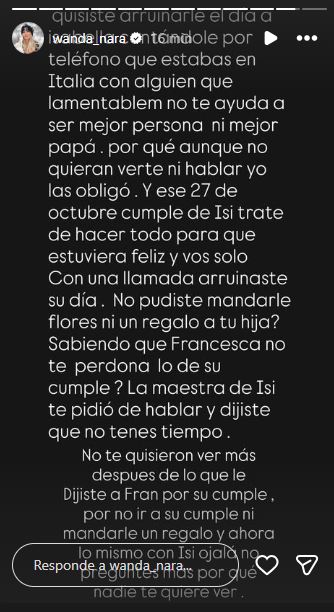 Filosa y sin ánimo de guardarse nada, Wanda aremetió sobre el cumpleaños de sus hijas: “Quisiste arruinarle el día contándole por teléfono que estabas en Italia con alguien que lamentablemente no te ayuda a ser mejor persona ni mejor papá. Porque, aunque no quieran verte ni hablar yo las obligo. Y ese 27 de octubre, cumple de (tu hija), traté de hacer todo para que estuviera feliz y vos solo con una llamada arruinaste su día. ¿No pudiste mandarle flores ni un regalo a tu hija, sabiendo que (tu otra hija) no te perdona lo de su cumple? La maestra de (tu hija) te pidió de hablar y dijiste que no tenés tiempo”.
