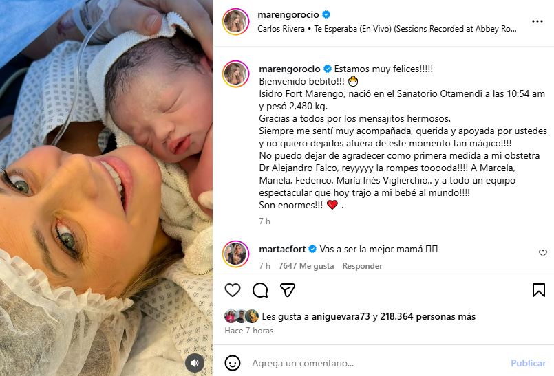 En sus redes sociales, Marengo presentó oficialmente a su hijo: "Estamos muy felices!!!!! Bienvenido bebito!!! 🐣 Isidro Fort Marengo, nació en el Sanatorio Otamendi a las 10:54 am y pesó 2,480 kg. Gracias a todos por los mensajitos hermosos. Siempre me sentí muy acompañada, querida y apoyada por ustedes y no quiero dejarlos afuera de este momento tan mágico!!!! No puedo dejar de agradecer como primera medida a mi obstetra Dr Alejandro Falco, reyyyyy la rompes tooooda!!!! A Marcela, Mariela, Federico, María Inés Viglierchio.. y a todo un equipo espectacular que hoy trajo a mi bebé al mundo!!!! Son enormes!!! ❤️".