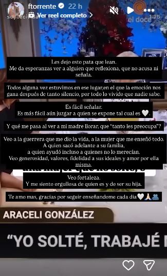 Flor Torrente fue a un punto que se hizo casi imposible en los últimos días. La presna la buscó y quería saber qué pensaba del llanto de su madre: "¿Y qué me pasa al ver a mi madre llorar, que 'tanto les preocupa'? Veo a la guerrera que me dio la vida, a la mujer que me enseñó todo, a quien sacó adelante a su familia, a quien ayudó incluso a quienes no lo merecían, veo generosidad, valores, fidelidad a sus ideales y amor por ella misma. Veo fortaleza. Y me siento orgullosa de quién es y de ser su hija".