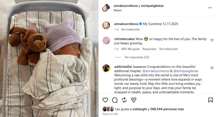 En su Instagram, Anna Kurnikova posteó la primera imagen pública del pequeño a la que acompañó con una tierna frase: "My sunshine (mi rayo de sol) 12.17.2025". Cabe recordar que la ex tenista y el cantante ya son padres de los mellizos Nicholas y Lucy de 8 años y de Mary de 5. Si bien el nuevo hermanito llegó a la familia el pasado 17 de diciembre, la pareja confirmó la noticia este 23 de diciembre.