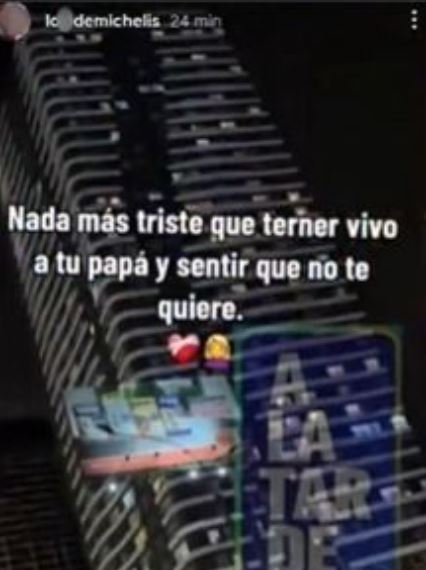 En sus historias, Lola Demichelis compartió una fuerte dedicatoria al ex DT de River: "Nada más triste que tener vivo a tu papá y sentir que no te quiere". Si bien el posteo apenas duró publicado unos minutos, la primera en capturar las imágenes fue Pochi de Gossipeame y a partir de allí ciclos como "Intrusos" y "A la tarde".