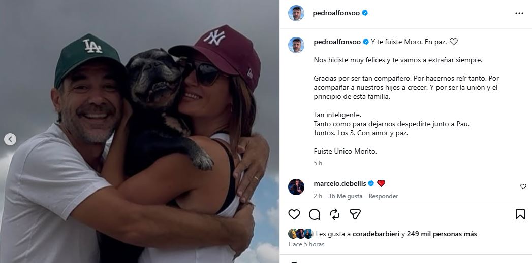 A lo largo de esta década y media, Morito los acompañó en la pareja y estuvo presente en el nacimiento de sus tres hijos… Olivia, Baltazar y Filipa. Tras su partida, Pedro se expresó en redes y así lo despidió: “Y te fuiste Moro. En paz. Nos hiciste muy felices y te vamos a extrañar siempre. Gracias por ser tan compañero. Por hacernos reír tanto. Por acompañar a nuestros hijos a crecer. Y por ser la unión y el principio de esta familia”.