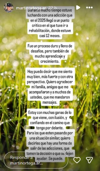 Martín habló con honestidad y llevando un mensaje de esperanza a muchos que pueden estar atravesando lo mismo que vivió en carne viva él: “Fue un proceso duro y lleno de desafíos, pero también de mucho aprendizaje y crecimiento. Hoy puedo decir que me siento muy bien, más fuerte y con otra perspectiva. Quiero agradecer a mi familia, a los amigos que me acompañaron y a muchos de ustedes que me mandaron mensajes”.